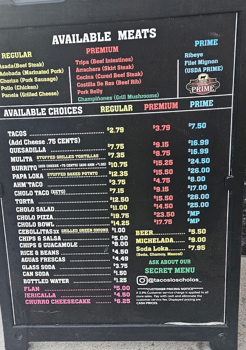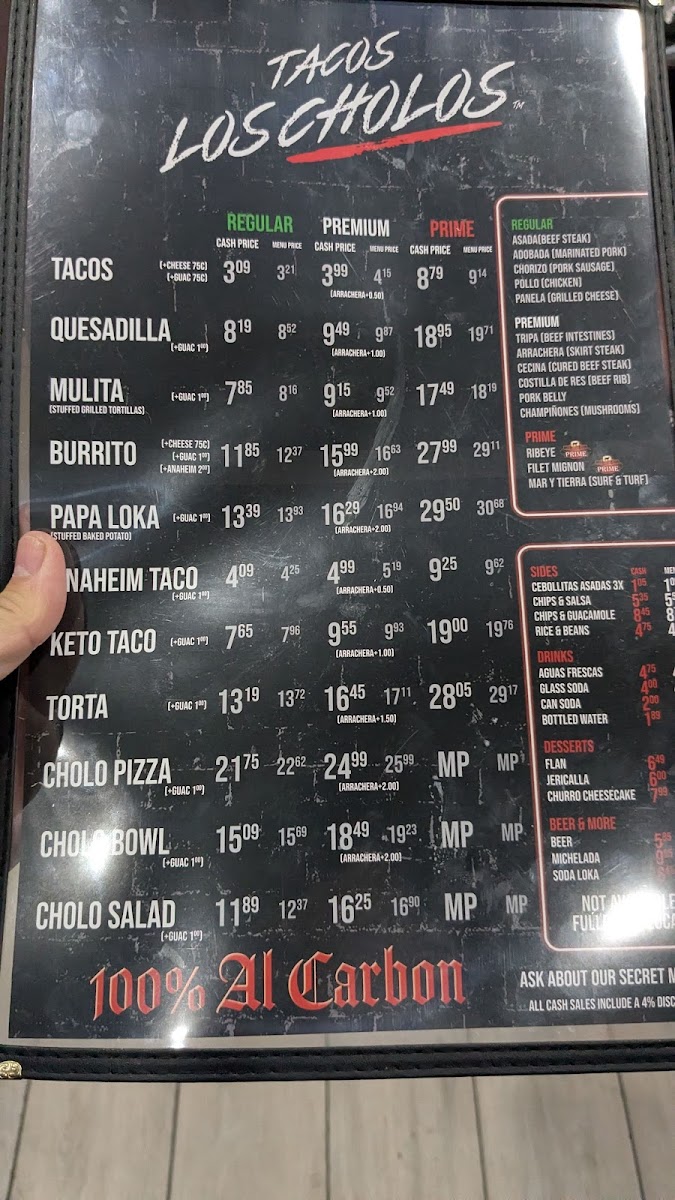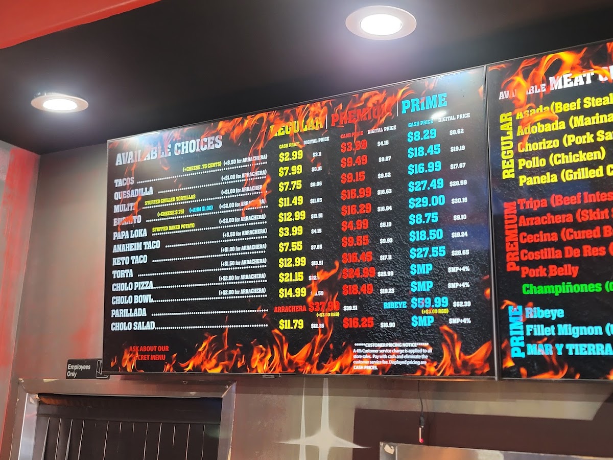 - Cholo Pizza and Cholo Salad: This category provides offerings that expand beyond traditional tacos, including different styles of Cholo Pizza and various Cholo Salads with options ranging from no meat to premium and prime versions.