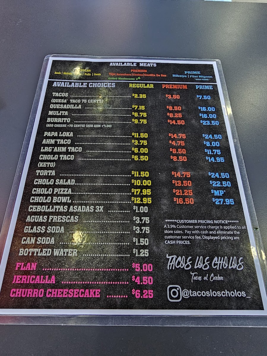 The menu at Tacos Los Cholos Hp offers a variety of traditional Mexican dishes focused primarily on tacos, mulitas, and other signature items crafted with diverse protein options. Diners can choose from a selection of specialty tacos including Pork Belly, Tripas, Chorizo and Mushroom, as well as premium options like Prime Rib Eye and Filet Mignon tacos. The menu is structured into several distinct groups to accommodate different preferences and meal types.